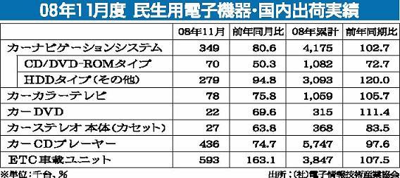 電子情報技術産業協会(JEITA)が発表した2008年11月度民生用電子機器・国内出荷実績は、前年同月比12.6%減の2573億円で2カ月連続のマイナスとなった。カーAVC機器は同24.3%減の567億円で2カ月連続のマイナスとなった。 ...