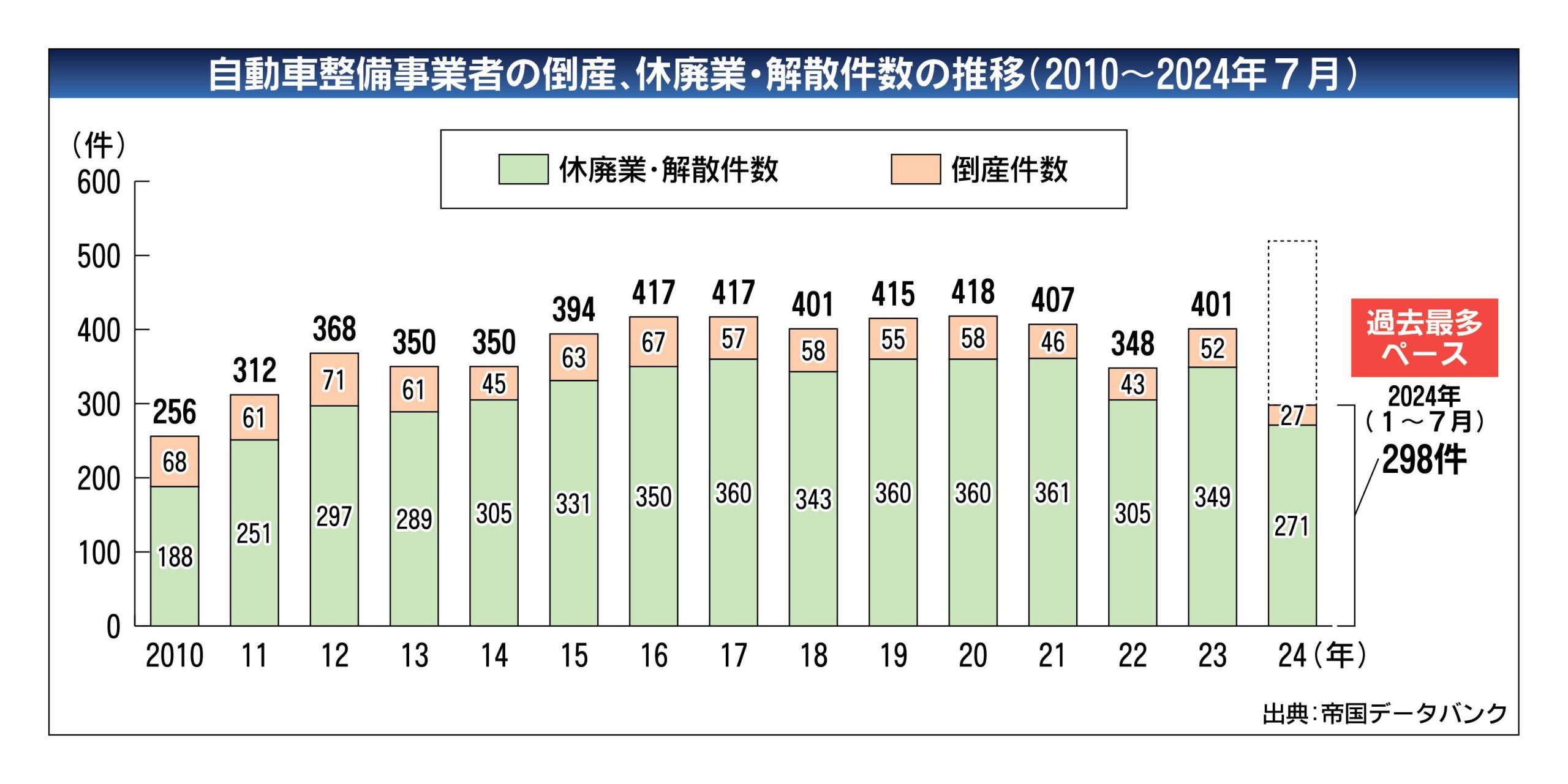 2024年に入り、自動車整備事業者の倒産(休廃業・解散含む)が過去最多ペースで推移している。帝国データバンクによると、7月までに298件(倒産27件/休廃業・解散271件)発生した。過去最多だった20年の418件(倒産58件/休廃業・解散...