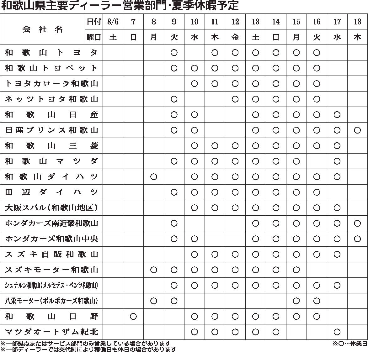 〈2022年 和歌山県主要ディーラー営業部門・夏季休暇予定〉