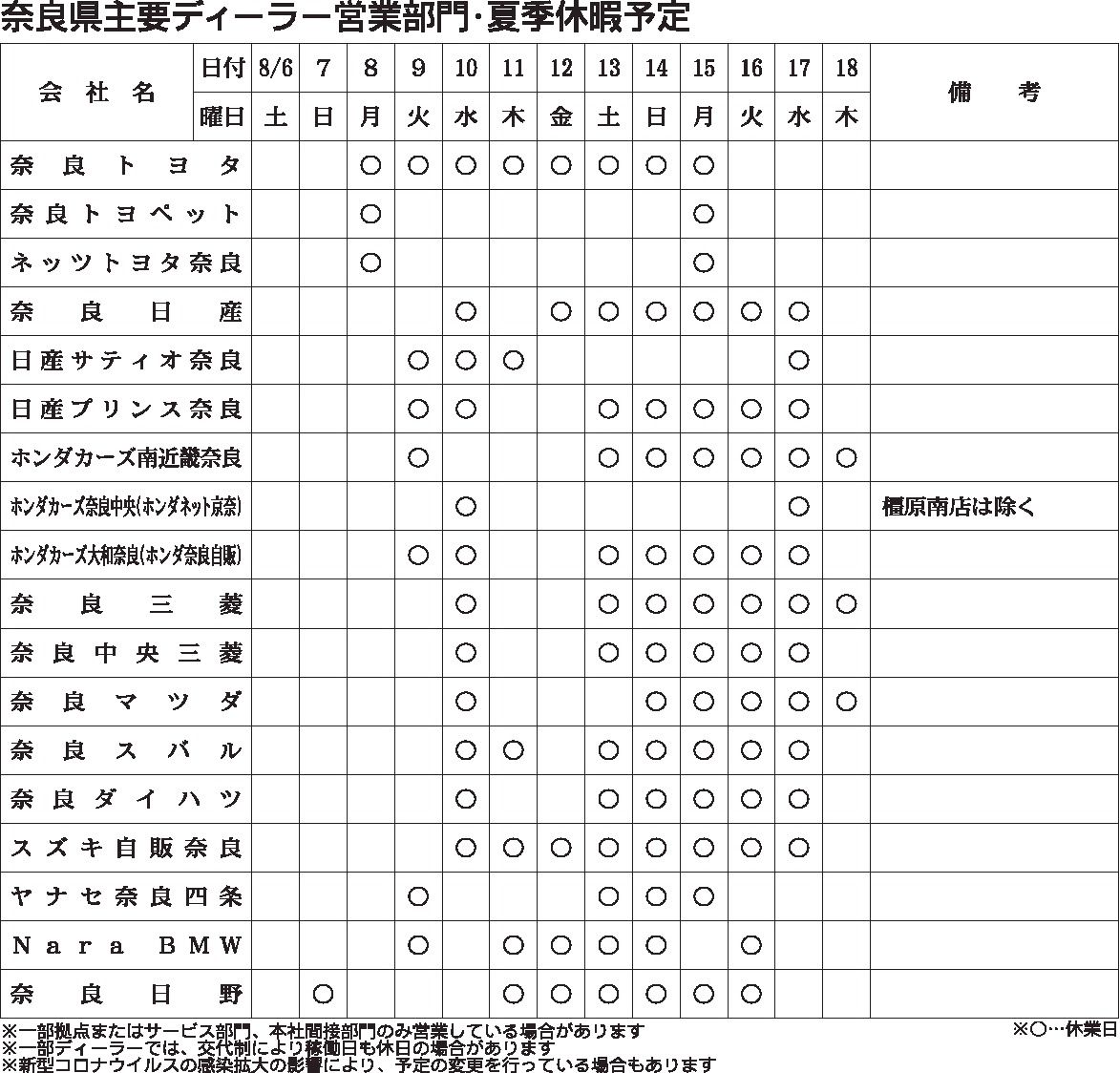 〈2022年 奈良県主要ディーラー営業部門・夏季休暇予定〉