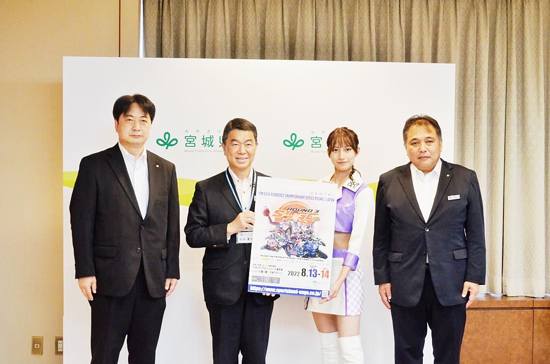 【仙台】「スポーツランドSUGO」を運営する菅生の遠藤渉社長らは、仙台市青葉区の宮城県庁で村井嘉浩知事と面談し「アジアロードレース選手権第3戦日本ラウンド」の開催に向けた報告を行った=写真。同レースは2輪の国際大会となり、スポーツランドS...