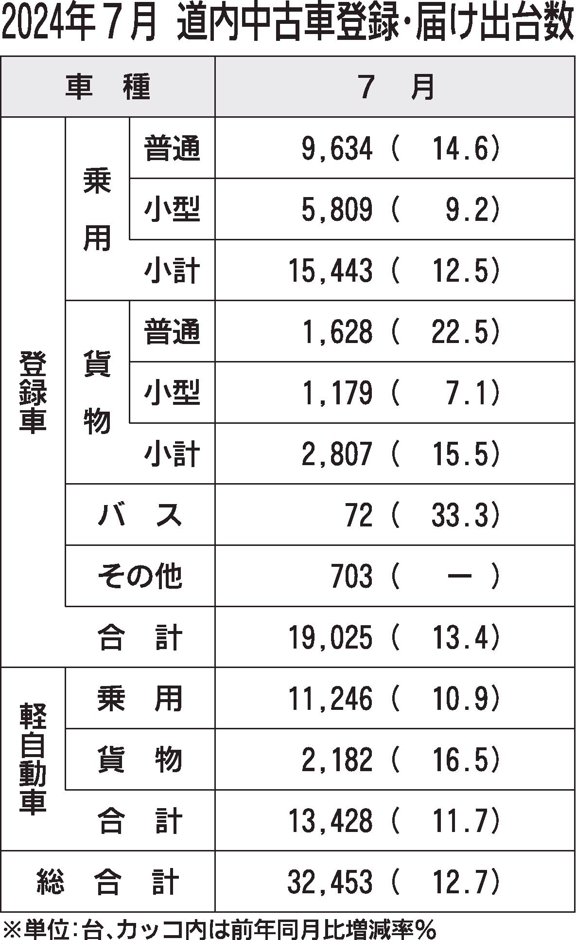 2024年7月の道内中古車登録・届け出台数は、前年同月比12.7%増の3万2453台だった。登録車、軽自動車ともに全ての車種で前年同月を大幅に上回った。 日本自動車販売協会連合会の中古車登録台数と全国軽自動車協会連合会の軽自動車中古車販売...
