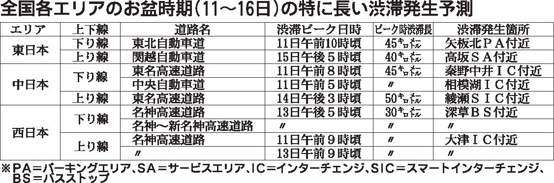 全国の高速道路各社は、お盆期間(10~16日)の渋滞予測を発表した。下り線では11日と13日に渋滞が多発し、上り線では14日が最も混雑する見通しだ。各社は利用日や利用時間帯の分散による渋滞回避を呼びかけている。 10㌔㍍以上の渋滞が発生す...