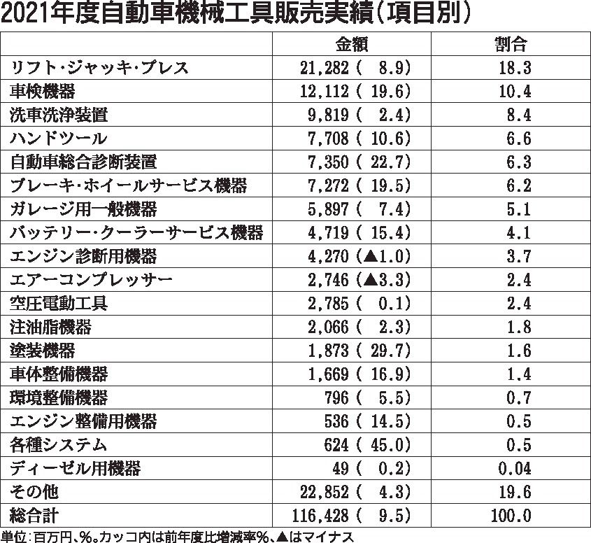 日本自動車機械工具協会(機工協、柳田昌宏会長)がまとめた2021年度「自動車機械工具販売実績」は、総売上金額に占める割合の大きい上位6項目すべてで前年度実績を上回った。そのうち、割合が1位のリフト・ジャッキ・プレスと、3位の洗車洗浄装置に...