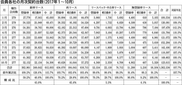 日本自動車リース協会連合会(JALA、東馬圭一会長)は、会員会社の2017年1~10月の契約台数を発表した。新車リースは前年同期比15・7%増の61万2603台だった。 新車リースのうち、登録車は同9・2%増の36万2961台、軽自動車は...
