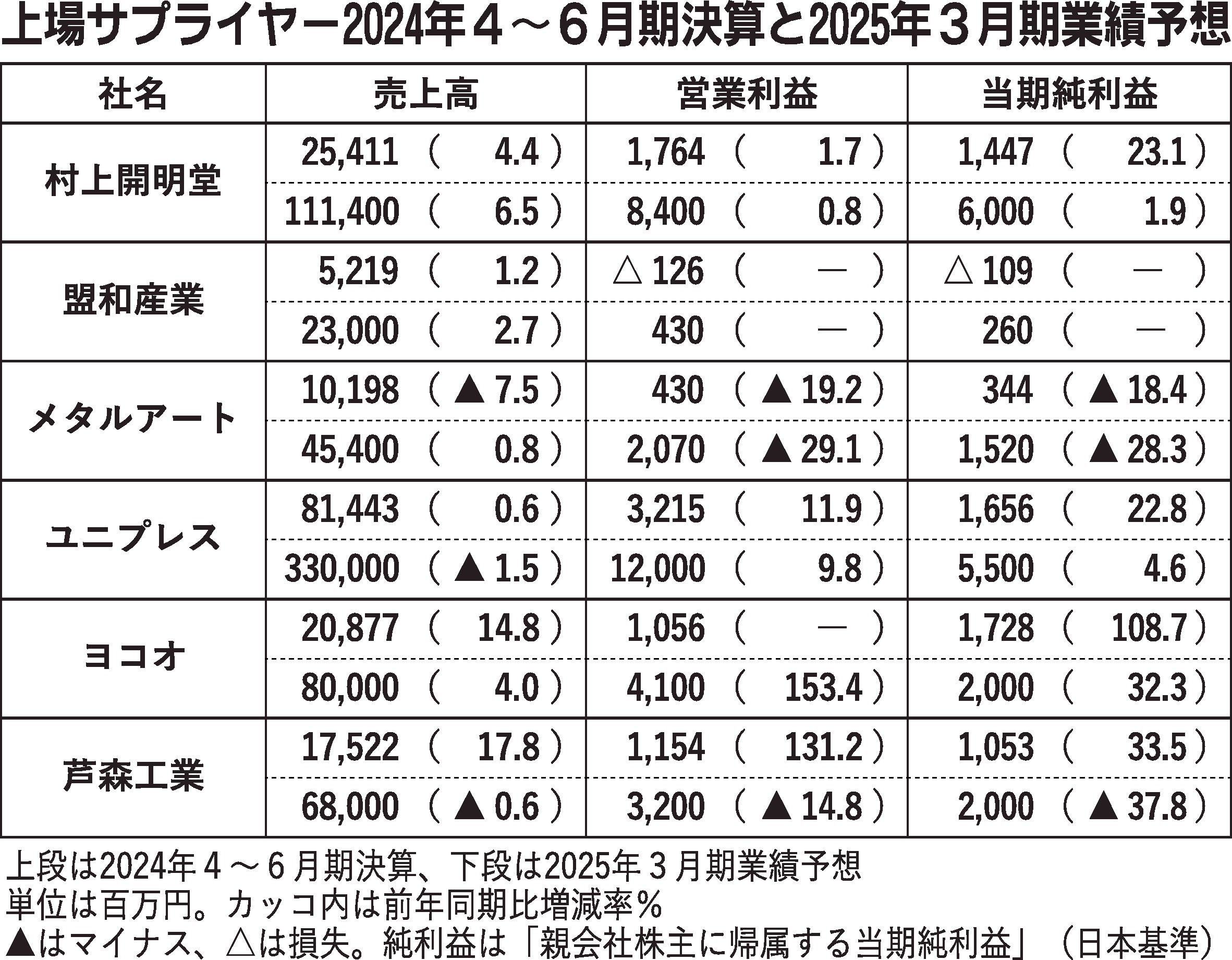 〈上場サプライヤー2024年4~6月期決算と2025年3月期業績予想〉(8/14付)