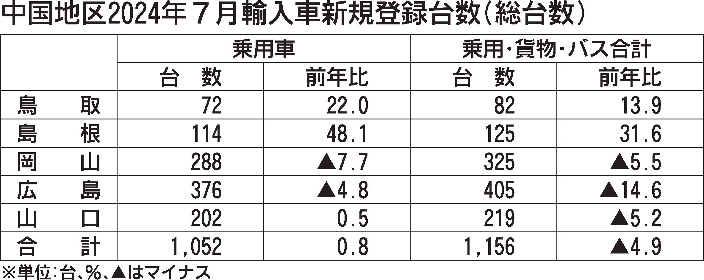 日本自動車輸入組合(JAIA)の発表によると、7月の中国地区の輸入車新規登録台数(外国メーカー車と日本メーカー車)は、前年同月比4.9%減の1156台で2カ月ぶりにマイナスとなった。 乗用車は同0.8%増の1052台で、岡山県と広島県で前...