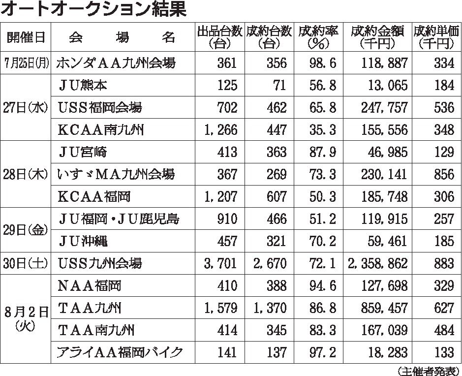 〈オートオークション結果〉九州地区 2022/7/25~8/2