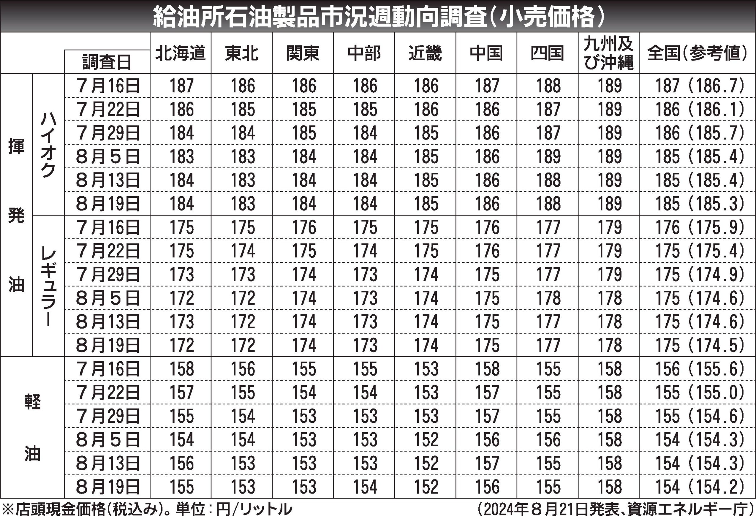 〈給油所石油製品市況週動向調査(小売価格)〉2024/7/16~8/19