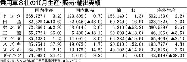 乗用車メーカー8社が29日に発表した2017年10月の生産・販売・輸出実績は、8社合計の世界生産台数が前年同月比3・7%増の247万4622台だった。日産自動車、マツダ、ダイハツ工業を除く5社がプラスで、ホンダ、スバル、スズキの3社が10...