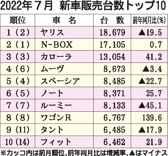 2022年7月の車名別新車販売台数は、トヨタ「ヤリス」が2カ月ぶりに首位へ返り咲いた。2位のホンダ「N―BOX(エヌボックス)」は、ヤリスに1600台ほど届かなかった。3位にはトヨタ「カローラ」が2カ月連続で入り、上位3車種のみが販売台数で1万台を超えた。上位10車種のうち、追加車種を投入したスズキ「ワゴンR」は前年同月実績を大幅に上回った。