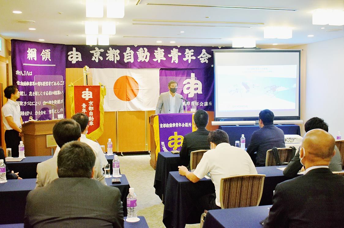 京都自動車青年会議所(渡邉努会長)は、京都市内のホテルで開いた7月例会で、「空飛ぶクルマ」の事業化を目指すスカイドライブ(福澤知浩CEO、愛知県豊田市)で、営業・渉外チームリーダーを務める羽賀雄介氏を招いた講演会を実施した=写真。 スカイ...