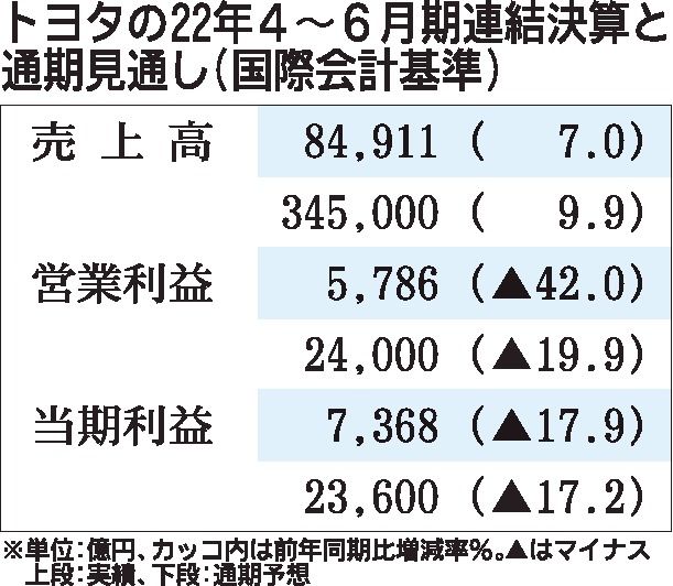トヨタ自動車が4日に発表した2022年4~6月期連結決算(国際会計基準、IFRS)は、営業利益が前年同期比42.0%減の5786億円となった。円安の為替効果があったが、半導体不足による減産や原材料価格の高騰などが影響した。売上高に相当する営業収益は円安効果から過去最高を更新した。23年3月期通期予想は円安効果から売上高と当期利益を上方修正したが、資材高騰や仕入先に対する価格改定見送りなどを織り込み、営業利益は据え置いた。