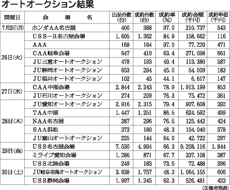 〈オートオークション結果〉中部圏 2022/7/25~30