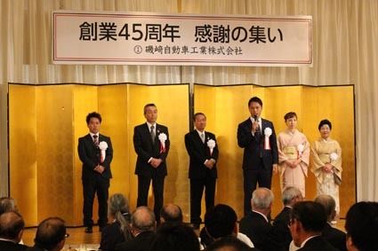 磯﨑自動車工業は17日、ひたちなか市のホテルで「創業45周年記念式典」を開催し、関係者や社員含め200人以上が出席し、創業の節目を盛大に祝った。 式典の冒頭では来賓の議員や市長の挨拶、主要取引先の紹介を行った。また、同日付けで磯﨑拓紀専務...