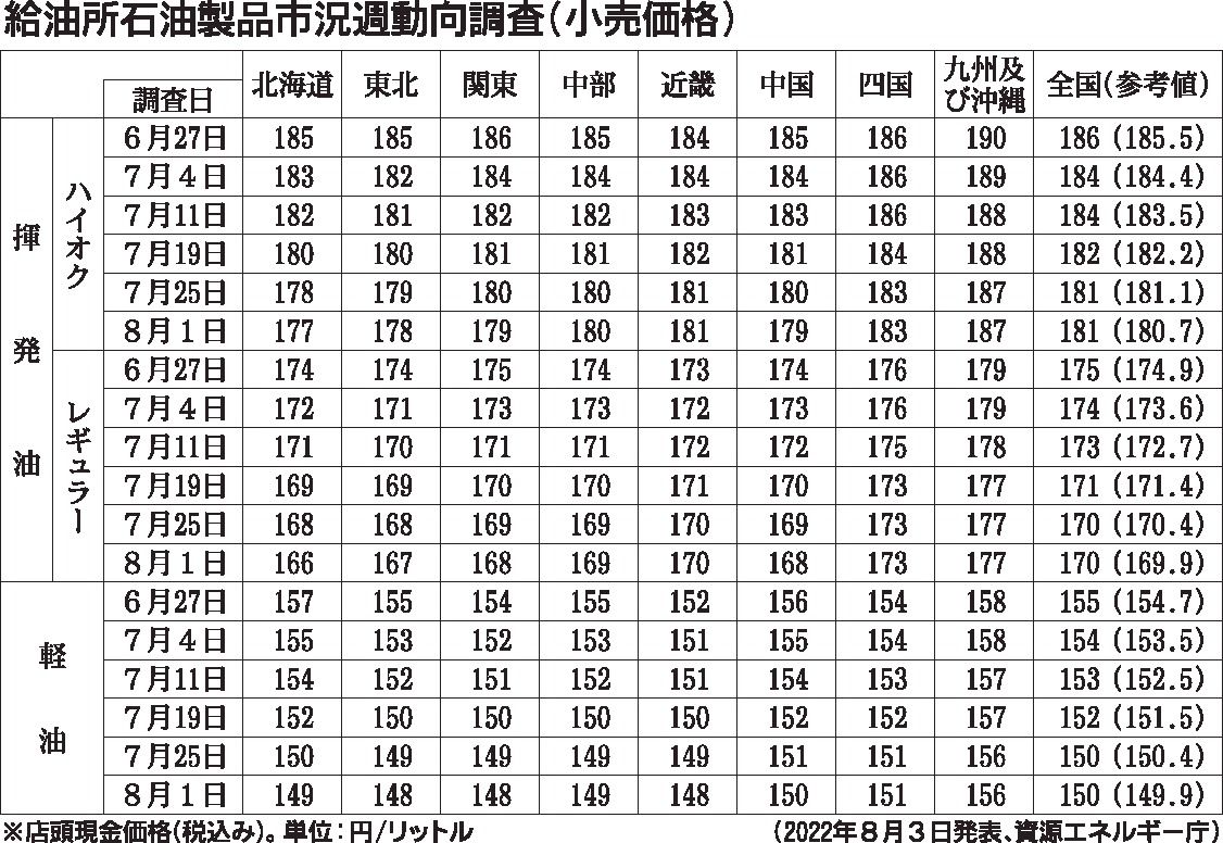 〈給油所石油製品市況週動向調査(小売価格)〉2022/6/27~8/1