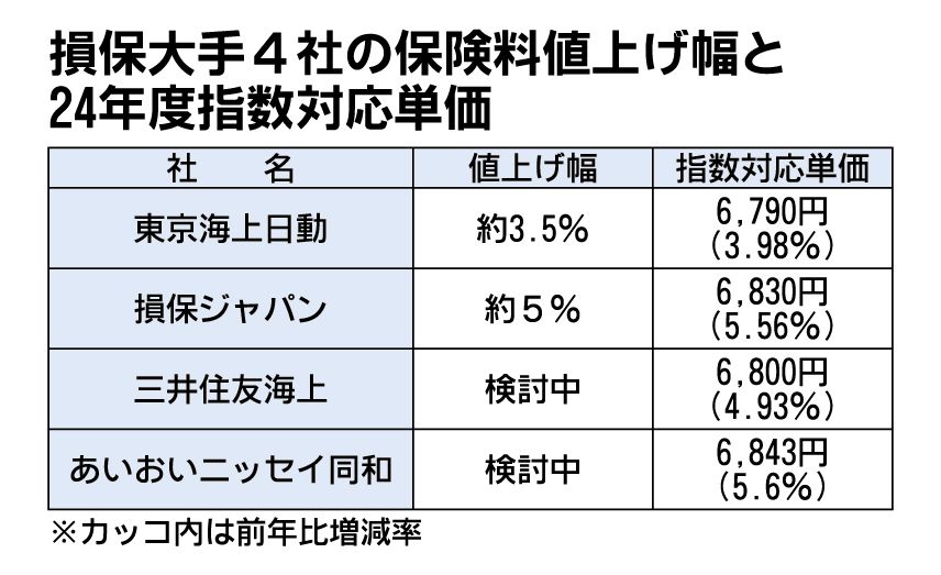 損害保険大手4社は、2025年1月に自動車保険の保険料を値上げする方針を固めた。東京海上日動火災保険は現行に比べて約3.5%、損害保険ジャパンは5%程度を上乗せする。MS&ADインシュアランスグループホールディングス傘下の三井住友海上火災...