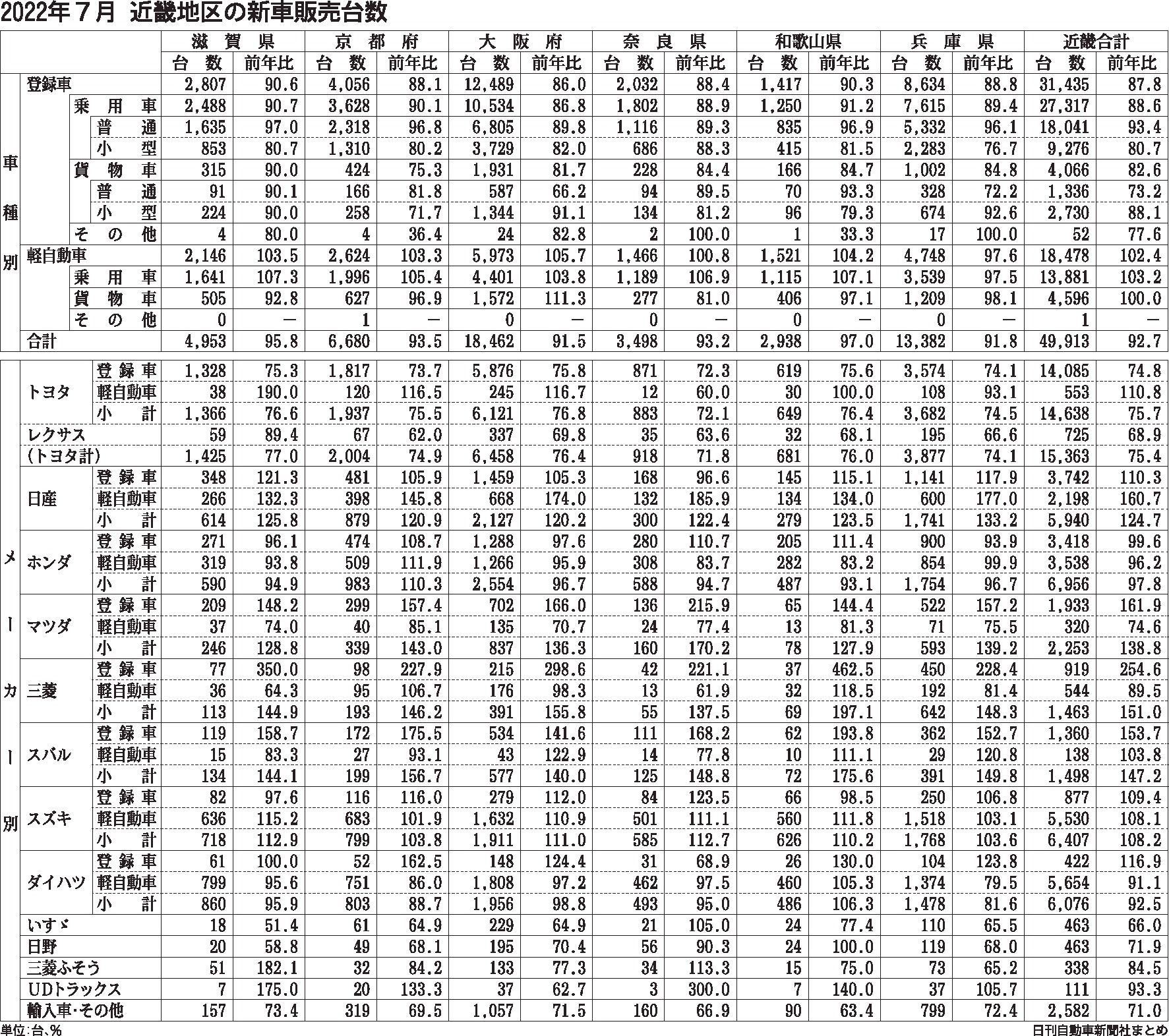 近畿2府4県の7月の新車販売台数(登録車+軽自動車)は、前年同月比7・3%減の4万9913台だった。前年割れは13カ月連続。軽が昨年6月以来となる前年超えを記録し、落ち込み幅も6月(13・6%減)比で6・3㌽縮まった。ただ、登録車の落ち込...