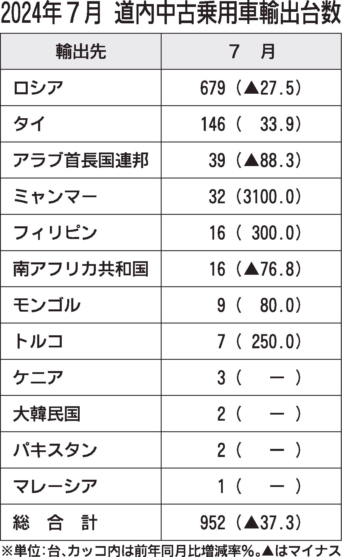 7月の道内中古車輸出(乗用車)台数は、前年同月比37.3%減の952台だった。前年割れとなるのは3カ月連続。アラブ首長国連邦(UAE)が9割減と大きく落ち込んだ。 最も多かったのはロシアで、679台。前年同月と比べると27.5%減少した。...