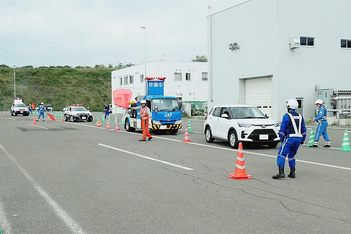 NEXCO東日本北海道支社と道警高速隊、日本自動車連盟(JAF)札幌支部(横井隆支部長)は、高速道路上の事故処理などでの連携強化を図るため、路上作業訓練を苫小牧中央インターチェンジ構内で実施した。 NEXCOと道警高速隊は高速道路上での円...