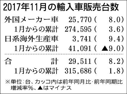 日本自動車輸入組合(JAIA)が6日発表した11月の外国メーカー車の新規登録台数は、前年同月比8・0%増の2万5770台となり、4カ月連続で前年実績を上回った。11月単月で過去2番目の台数を記録し、登録車全体に占めるシェアは過去最高の10...