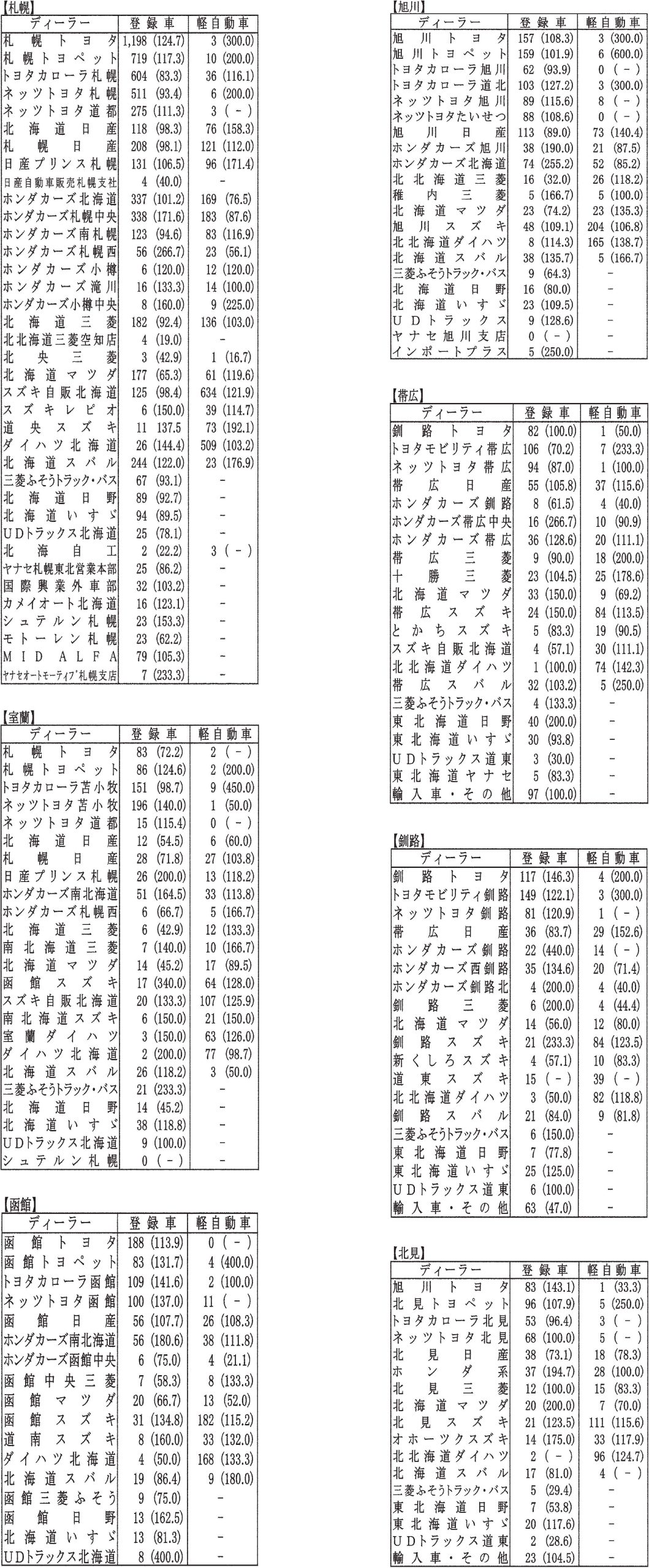 〈7月度全道管内別ディーラー別新車登録・届け出台数(カッコ内は前年同月比)〉札幌管内ホンダ系・スズキ系の登録台数は自販連正会員分