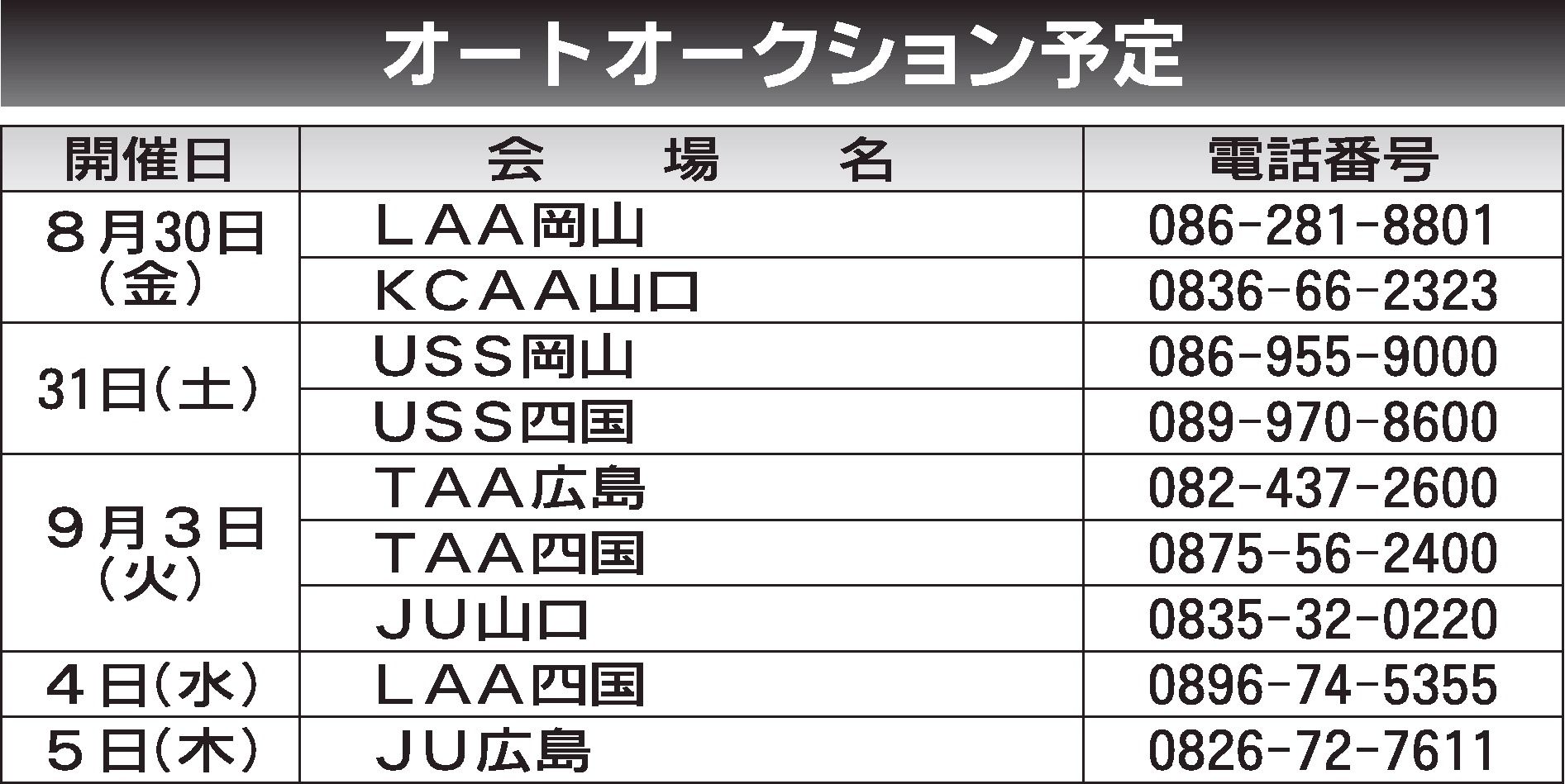〈オートオークション予定〉中四国地区 2024/8/30~9/5