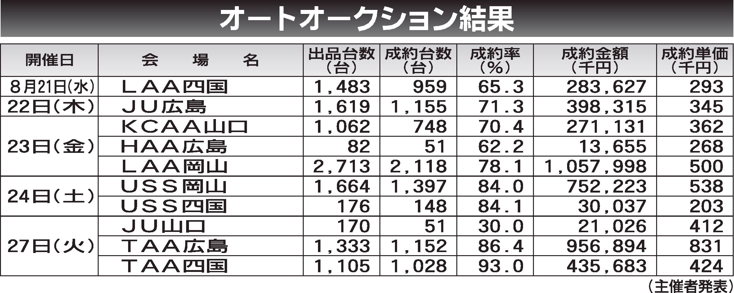 〈オートオークション結果〉中四国地区 2024/8/21~27