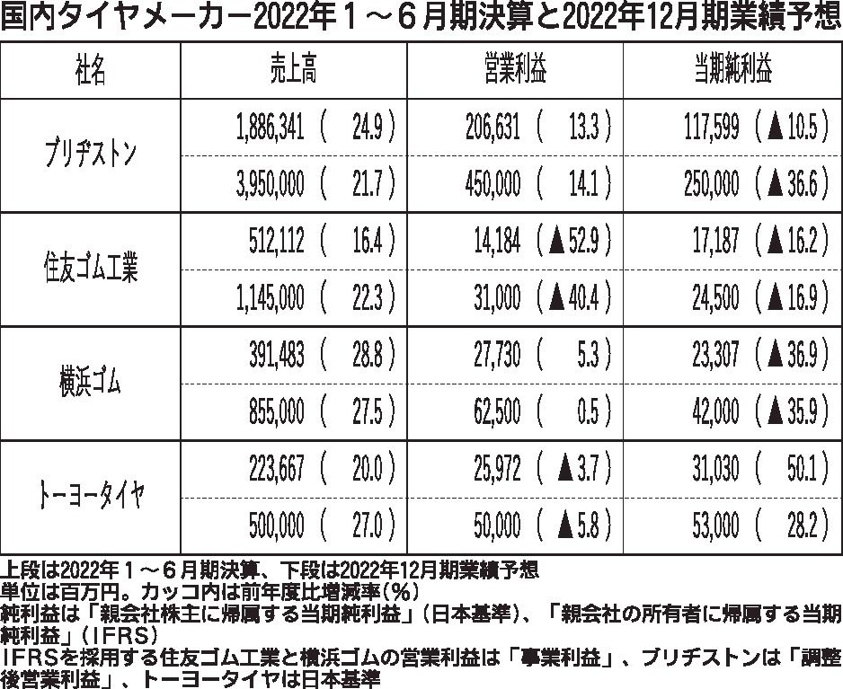日本のタイヤメーカー4社の2022年1~6月期連結業績が出そろった。主に欧米市場でのタイヤ需要の増加や円安による為替換算の影響もあって売上高は4社とも大幅増収となり、3社が通期業績見通しの売上高を上方修正した。収益面では、原材料価格や海上...