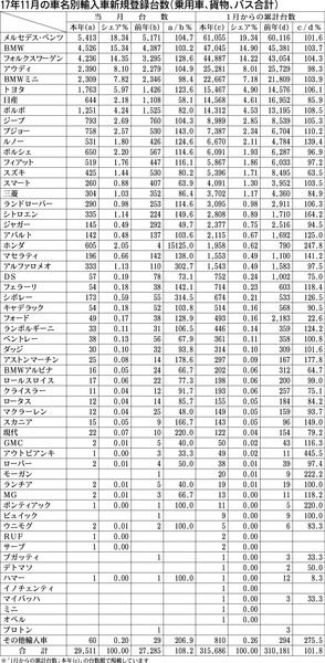 17年11月の車名別輸入車新規登録台数は上位のドイツ勢がいずれも堅調で、このうちフォルクスワーゲンは同28・6%増を記録した。一方、BMWミニは同1・6%減にとどまった。 この他ではプジョーが4割増、ルノーも2割増となっているうえシトロエ...