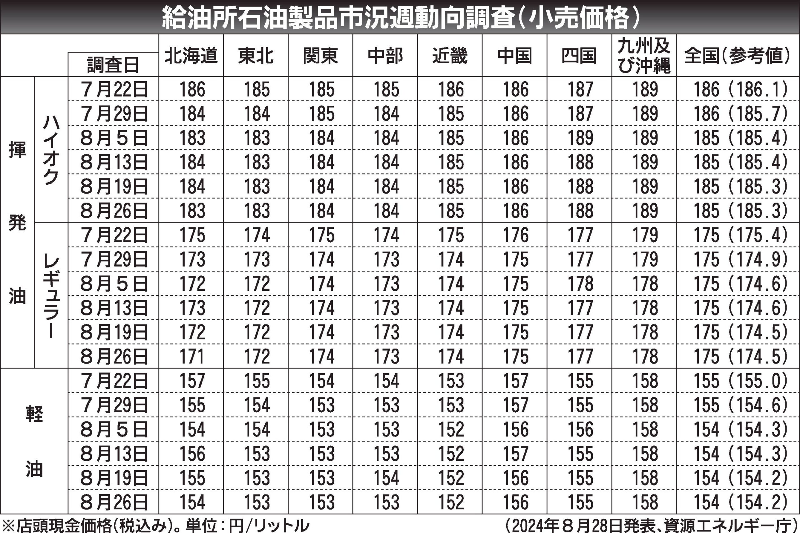 〈給油所石油製品市況週動向調査(小売価格)〉2025/9/22~10/27