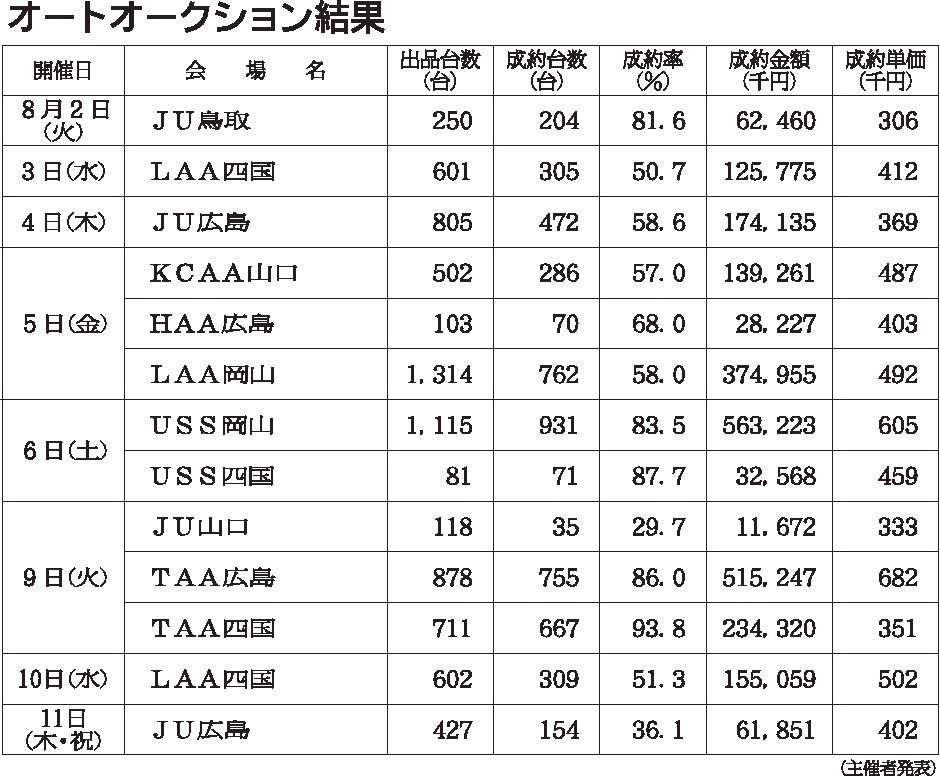 〈オートオークション結果〉中四国地区 2022/8/2~11