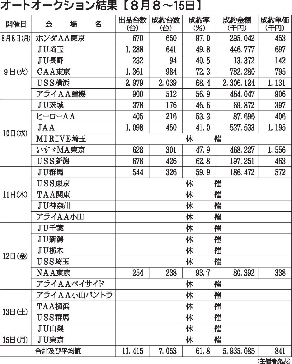 〈オートオークション結果〉首都圏 2022/8/8~15