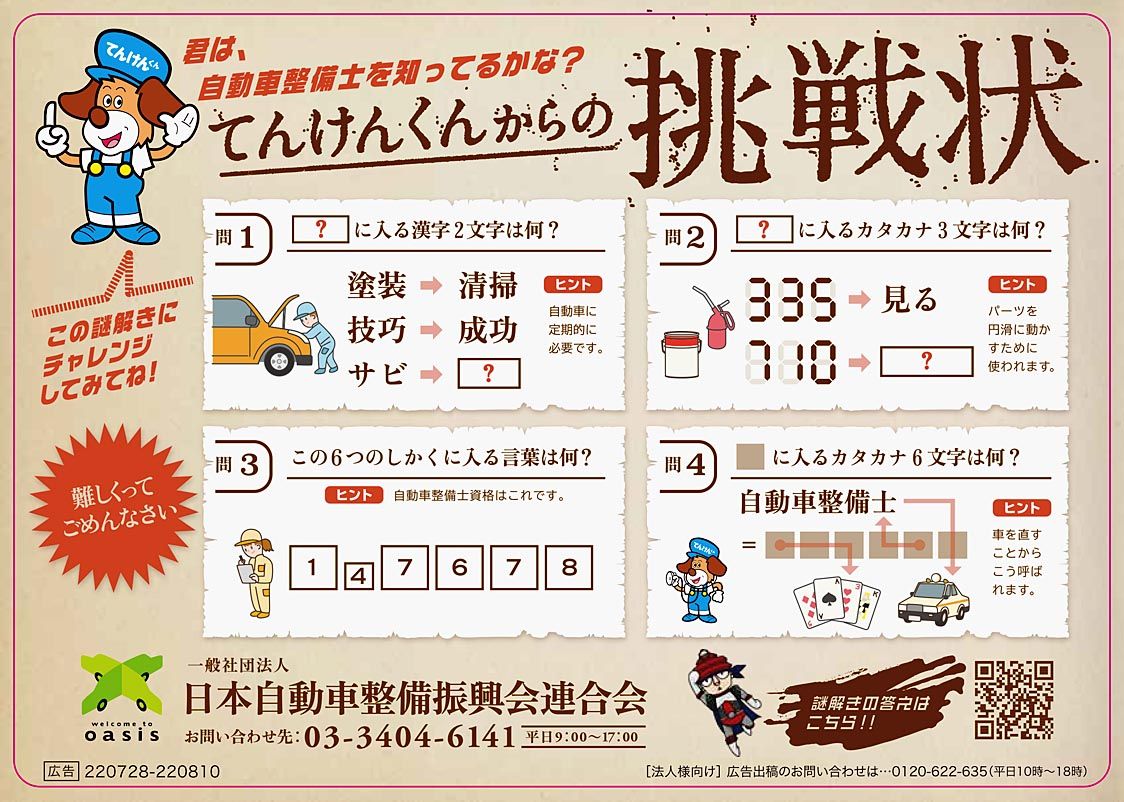 日本自動車整備振興会連合会(日整連、竹林武一会長)が、自動車整備士の認知向上を目的にファミリーレストランにテーブルステッカー広告を実施した。学生が集まりやすい全国の繁華街にある250店舗に掲出。広告は注文品が届くまでの時間でできる「謎解き」ゲームにし、答えの確認で日整連ホームページに誘導する仕組みとした。回答ページにはPR漫画を掲載するなどし、整備士の周知を図っている。