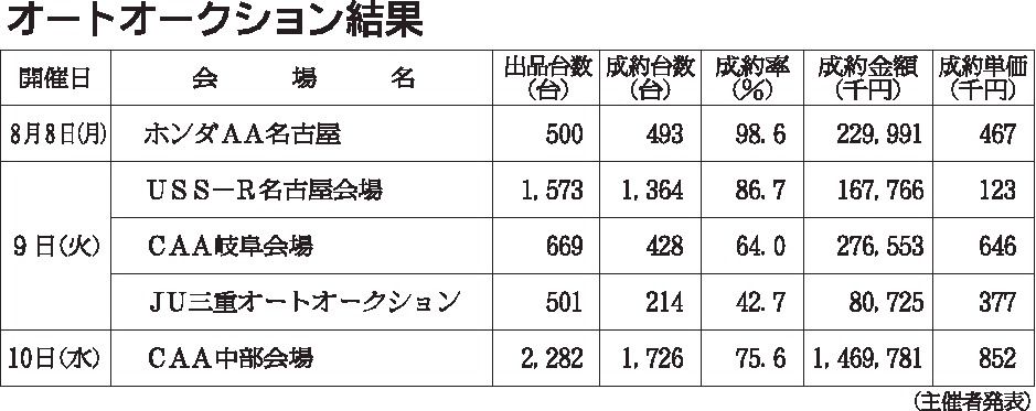 〈オートオークション結果〉中部地区 2022/8/8~10
