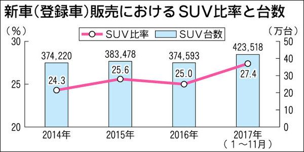 登録車市場において、SUVのシェアがじわじわと拡大している。ここ4年ほどは25%前後で推移しており、トヨタ自動車「C―HR」やマツダ「CX―5」、スバル「XV」といった新型車が追い風となった2017年1~11月は27・4%まで高まった。近...