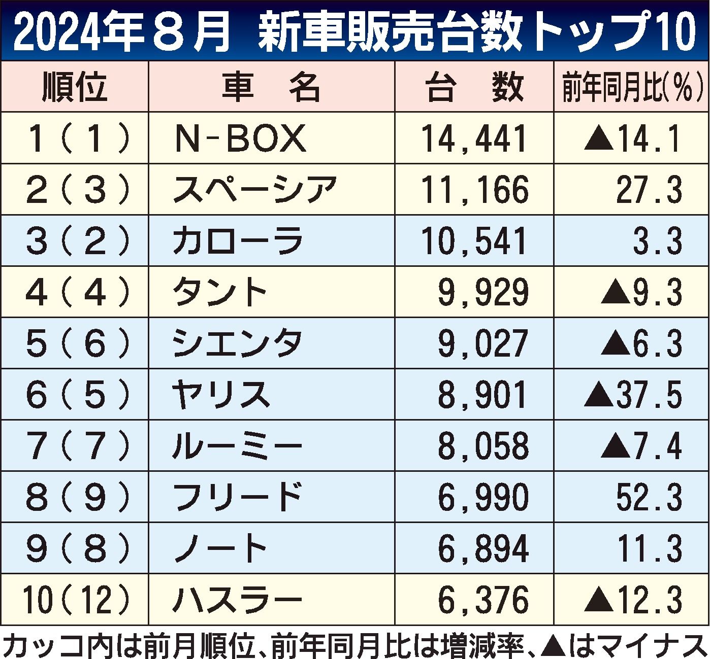 8月の車名別国内新車販売(登録車と軽自動車の合計)は、ホンダ「N―BOX(エヌボックス)」が首位だった。2位以下に3千台超の差をつけ、3カ月連続で8月も首位を守った。ただ、上位10車種中、6車種が前年実績を下回った。認証不正に伴う一部メーカーの生産停止や8月下旬の台風10号による販売店の臨時休業などが響いた。