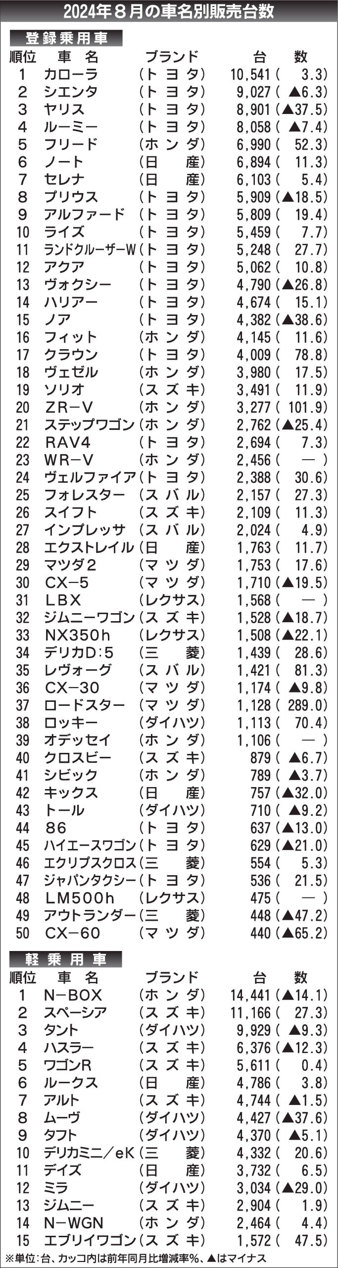 〈2024年8月の車名別販売台数〉