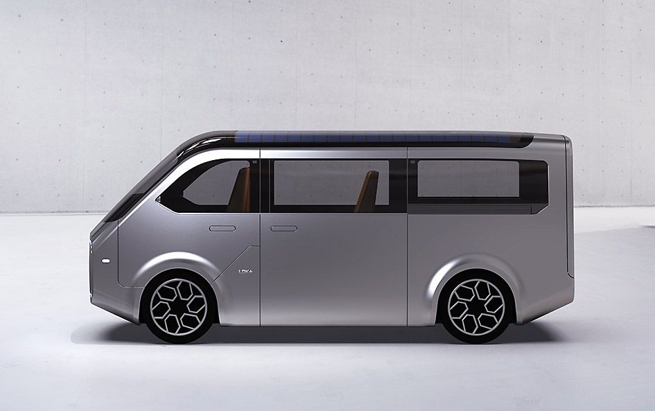 車体の上には同社のペロブスカイト太陽電池を搭載。蓄電池や家全体とつながり、AIで家とEVのエネルギーマネジメントを最適化する。