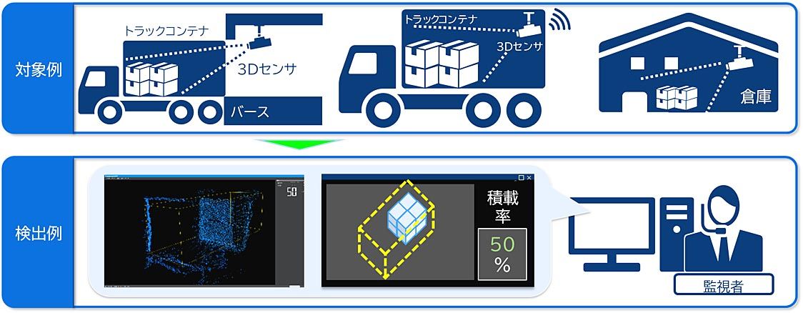 NEC通信システム(佐藤祟社長、東京都港区)は、3Dセンサーを活用してトラックコンテナの積載量を可視化する「NEC3次元積載量可視化ソフトウエア」の提供を開始した=同ソフトのイメージ。積載状況を自動的に数値化するなど、運行管理や倉庫内の在...