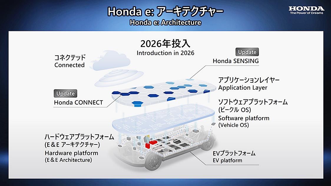 ホンダは今年、中国市場に投入したEV2モデルにEV専用プラットフォームを開発して実用化したが、これとは別に26年にEV専用プラットフォーム「e:アーキテクチャー」を開発する計画だ。新開発プラットフォームは、OTA(オーバー・ジ・エア)によって無線通信でソフトウエアをアップデートし、後から機能を追加できる新しいE&Eアーキテクチャーを組み合わせる。