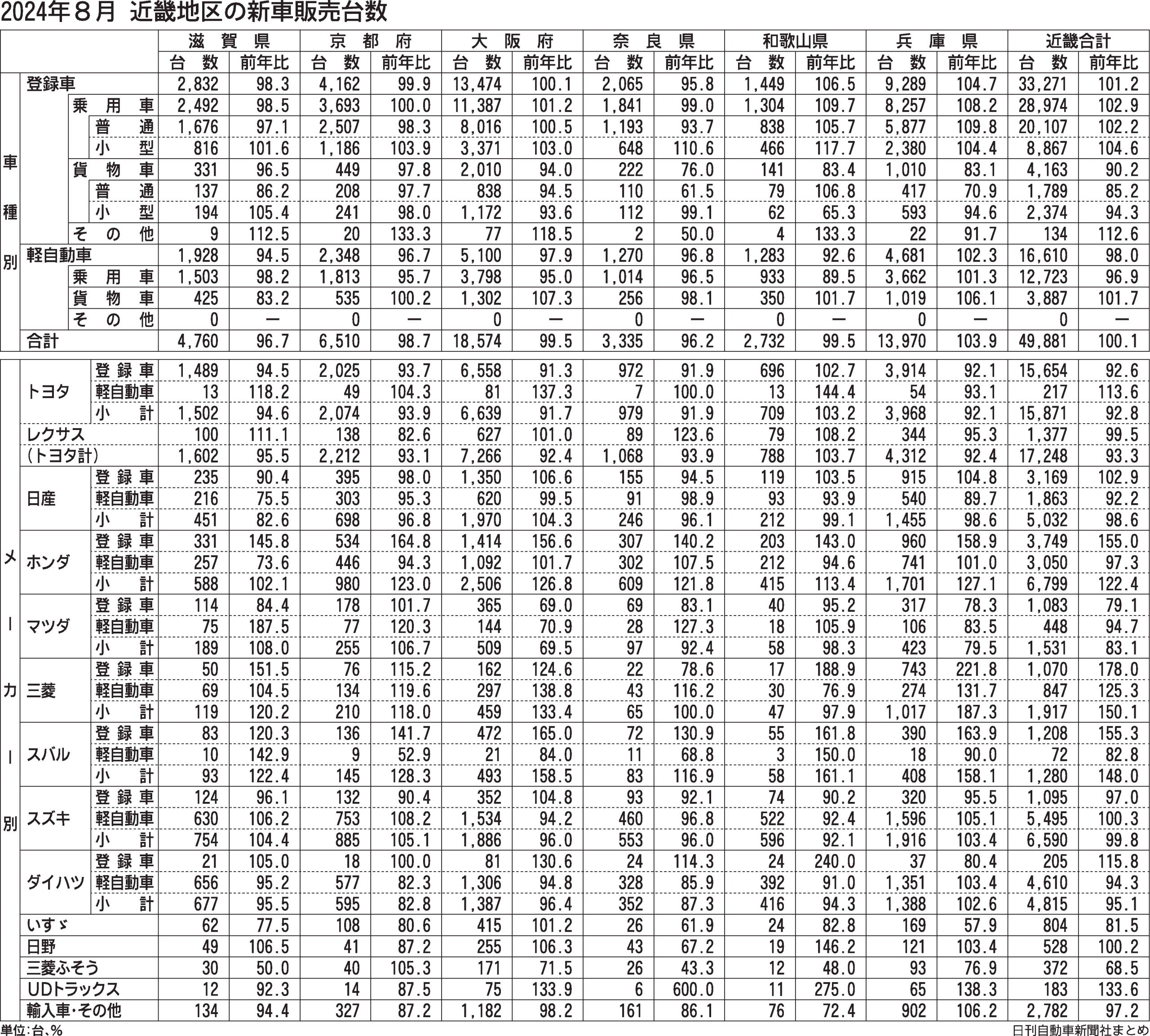 近畿2府4県の8月の新車販売台数(軽自動車含む)は、前年同月比0.1%増の4万9881台で2カ月連続の前年超えとなった。兵庫県を除く5府県でマイナスとなったが、台風など気象影響が限定的だったこともあり、市場全体では横ばいとなった。9月上旬...