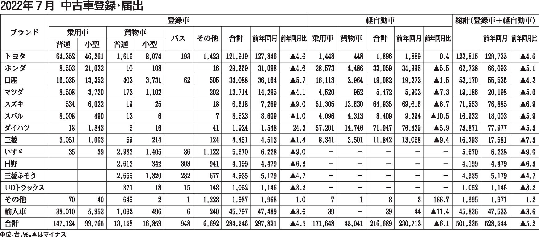2022年7月のメーカー別中古車登録・届け出台数は、前年同月比5・2%減の50万1235台だった。このうち、登録車が同4・5%減の28万4546台、軽自動車も同6・1%減の21万6689台とマイナスとなった。国内メーカー全てが前年同月実績...
