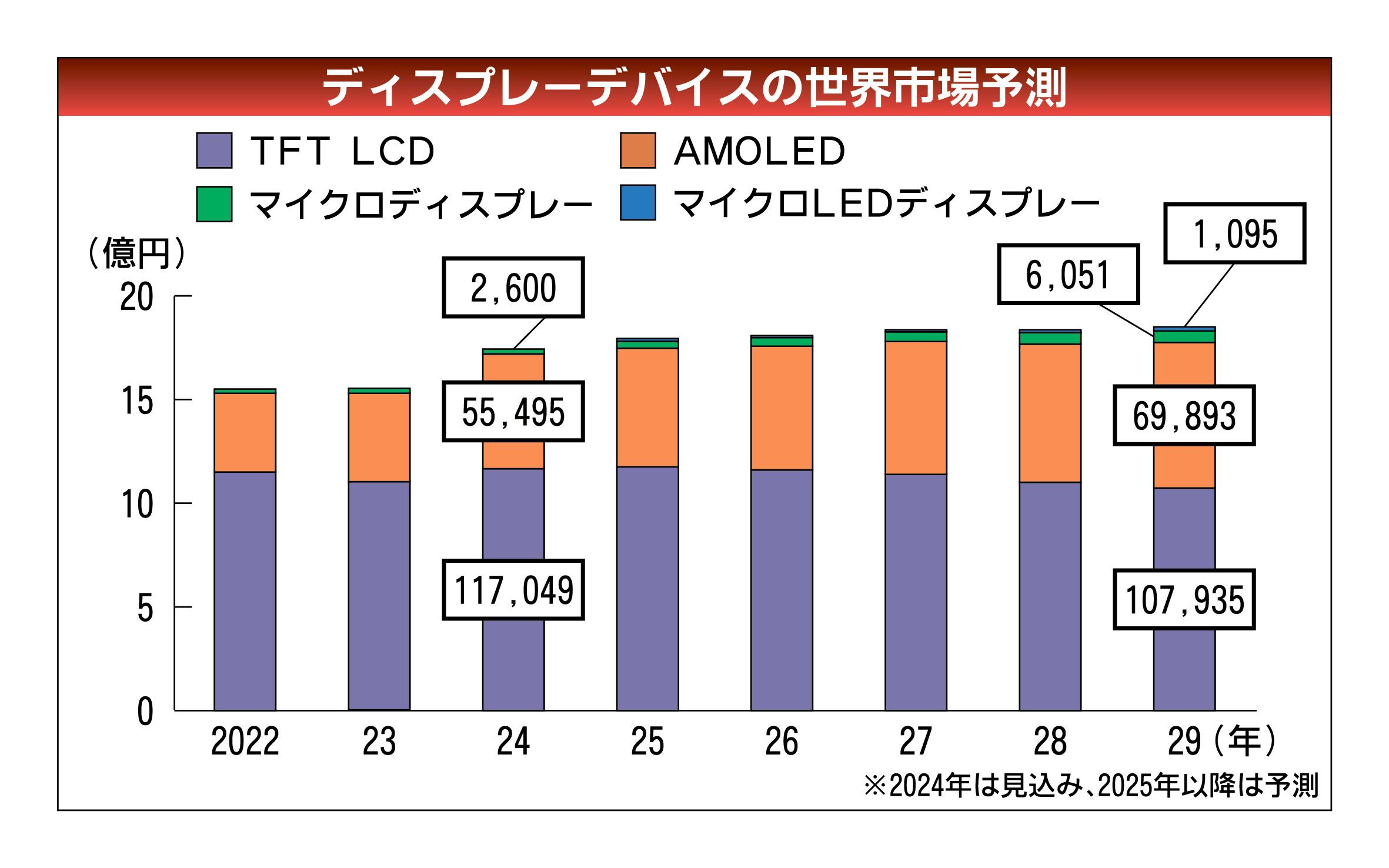 富士キメラ総研(田中一志社長、東京都中央区)は、ディスプレーデバイスの世界市場が2029年に23年比18.5%増の18兆4974億円に拡大するとの調査結果をまとめた。薄膜トランジスタ(TFT)液晶は微減だが、アクティブマトリクス式有機EL...