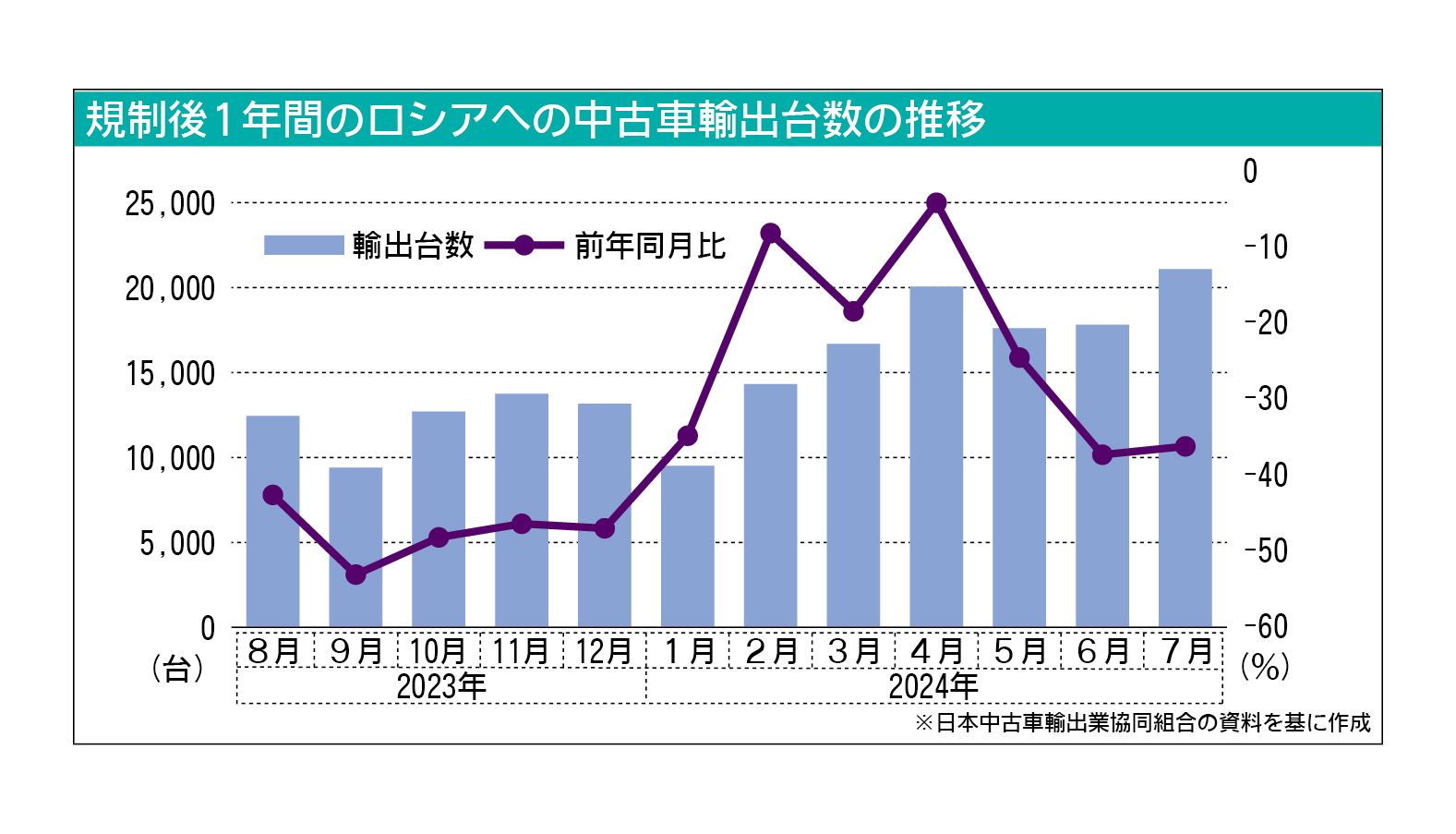 政府がロシアへの輸出規制を厳格化した2023年8月から1年間で、中古車の輸出台数が前年同期比34.8%減の17万8515台にとどまったことが分かった。24年7月までのすべての月がマイナスとなった。この間の輸出全体が同11.1%増の156万...