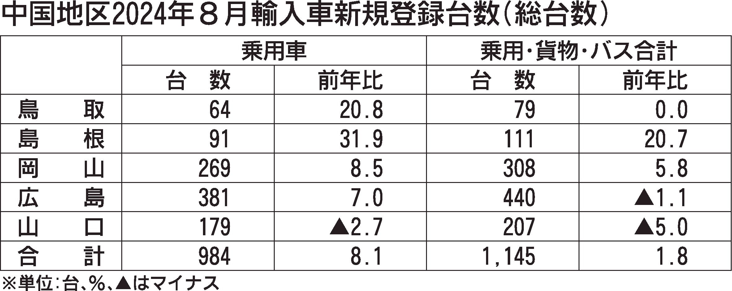 日本自動車輸入組合(JAIA)の発表によると、8月の中国地区の輸入車新規登録台数(外国メーカー車と日本メーカー車)は、前年同月比1.8%増の1145台で2カ月ぶりにプラスとなった。 乗用車は同8.1%増の984台で、7カ月連続で前年超え。...