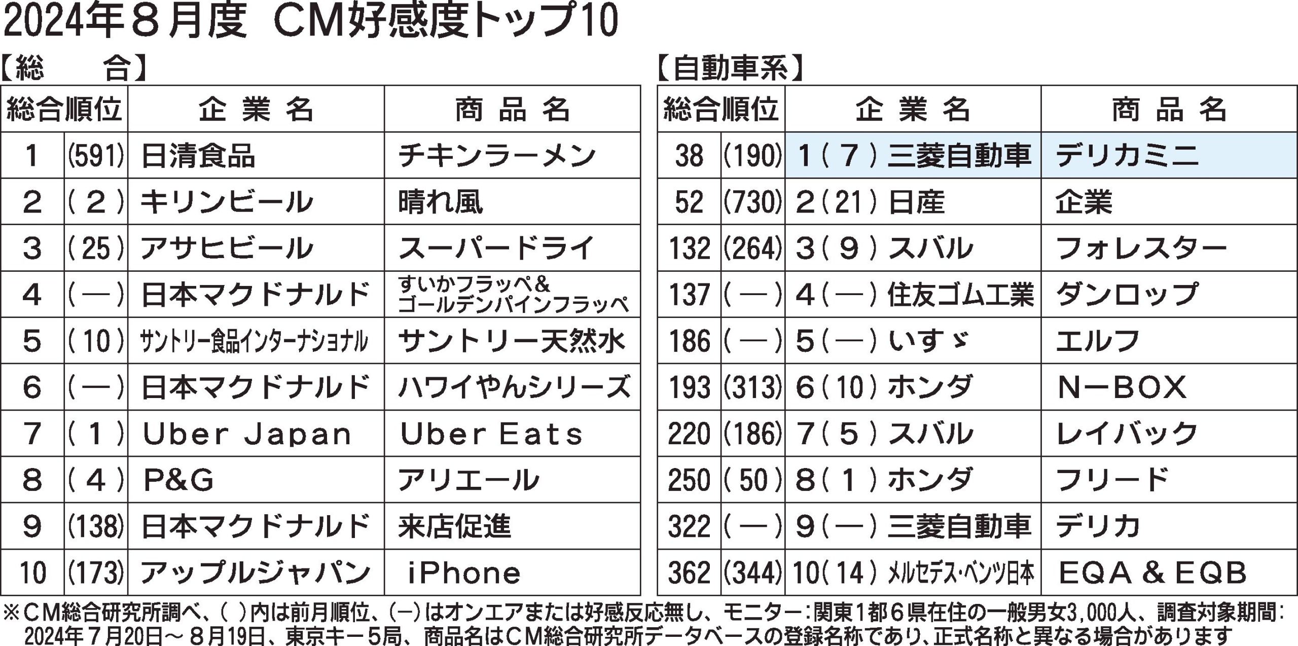 〈2024年8月度CM好感度ランキング〉三菱「デリカミニ」が3カ月ぶり9回目の首位 季節感あふれる〝可愛さ〟が人気