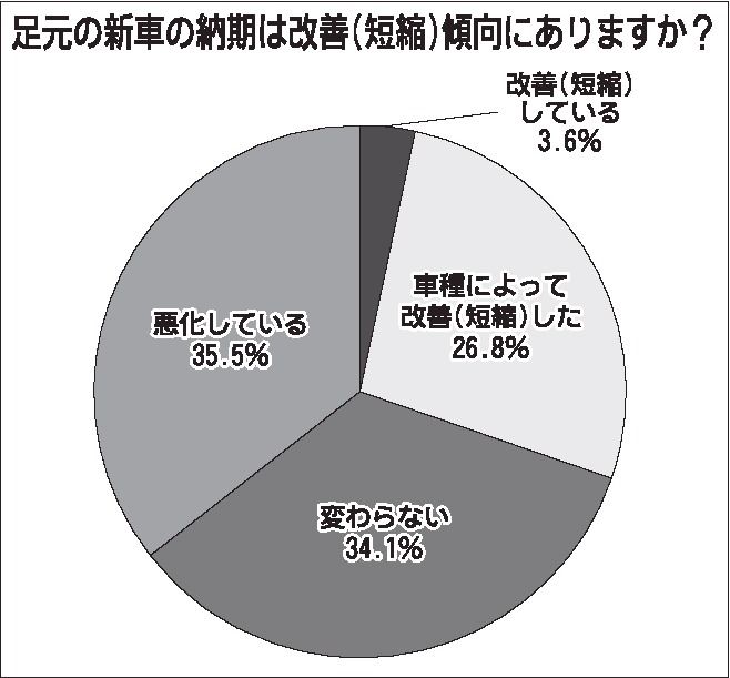 日刊自動車新聞が実施したディーラーアンケートでは、新車の納期について「変わらない」と「悪化している」の回答数が全体の約7割を占めた。特に、トヨタ自動車系と日産自動車系、ダイハツ工業系、日野自動車系の販売会社の回答では、大半がこの2つで占め...