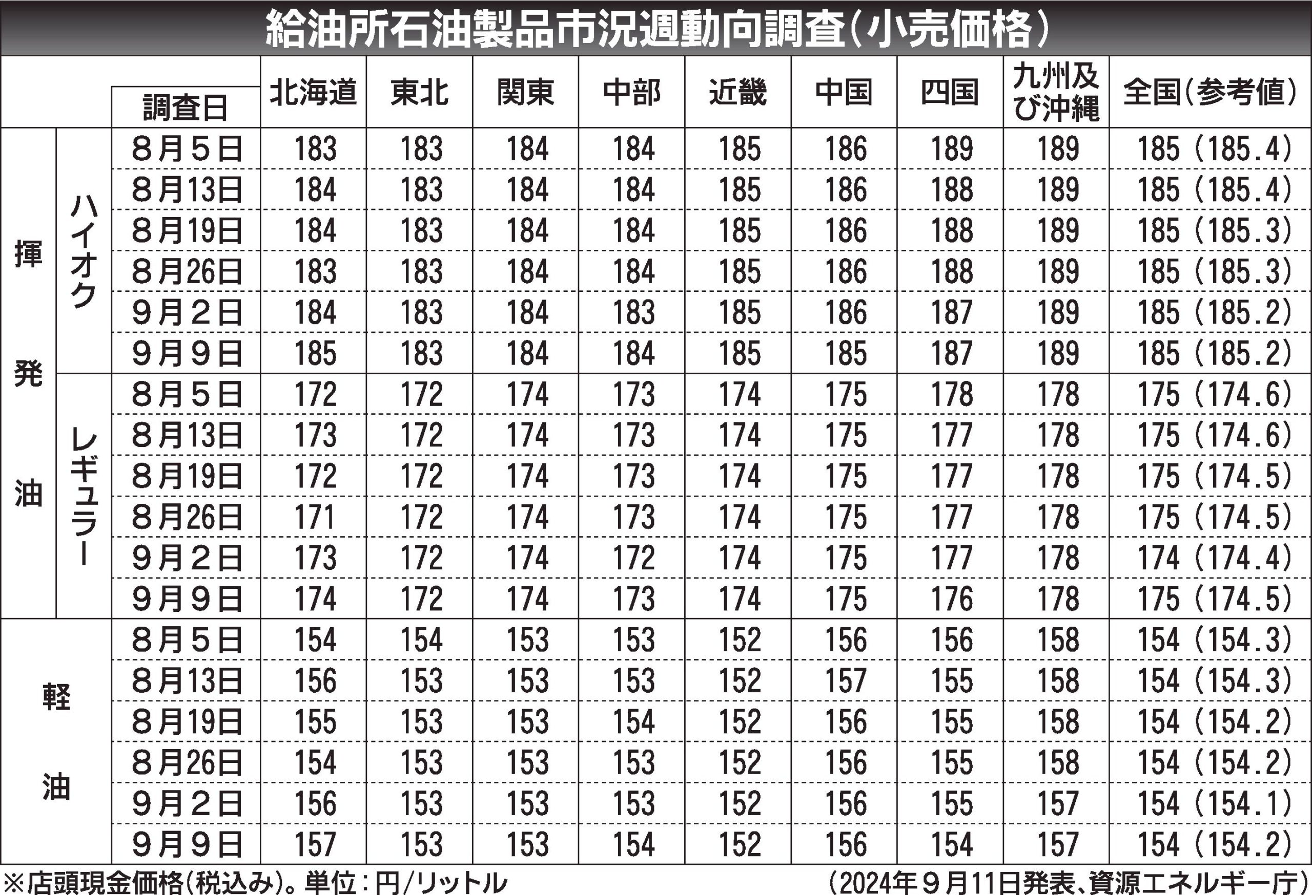 〈給油所石油製品市況週動向調査(小売価格)〉2024/8/5~9/9