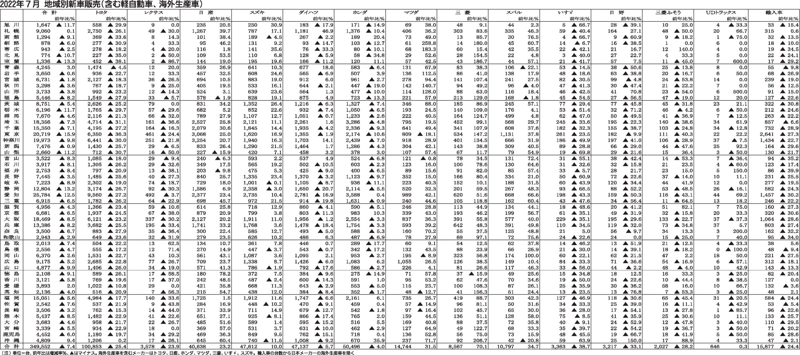 〈2022年7月 地域別新車販売(含む軽自動車、海外生産車)〉